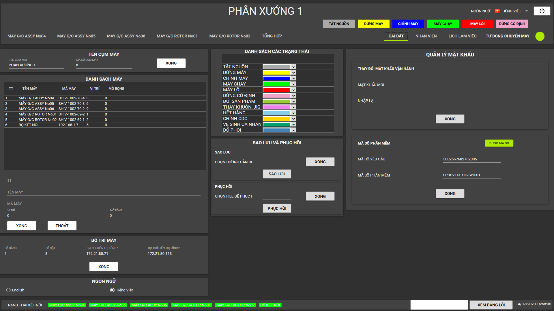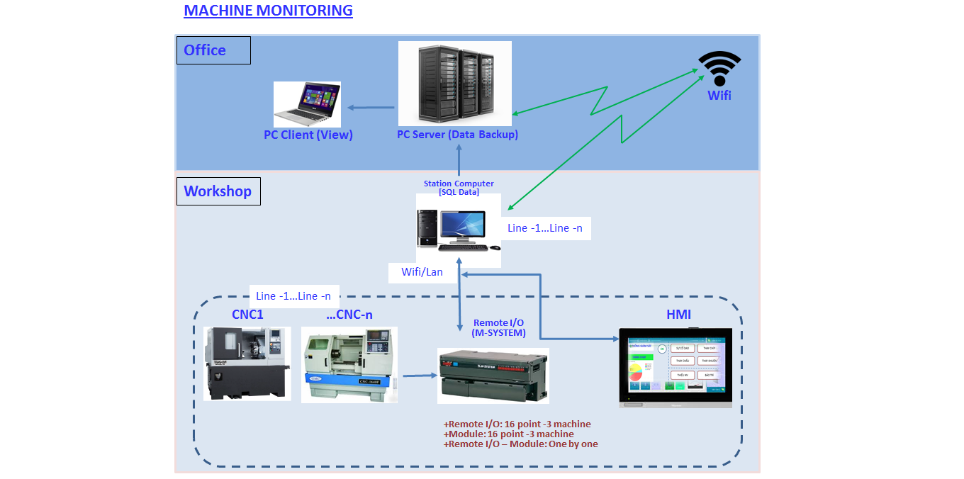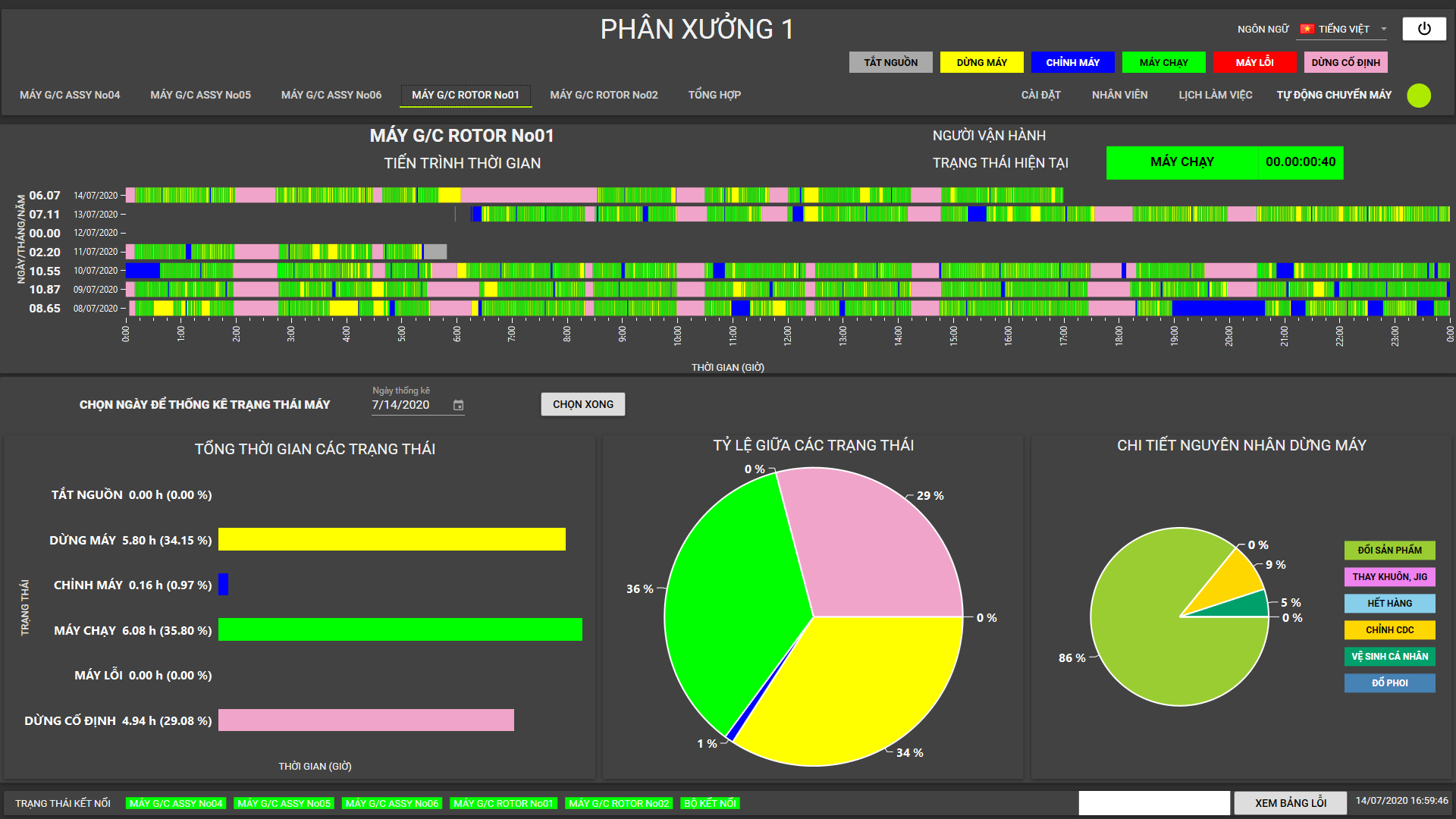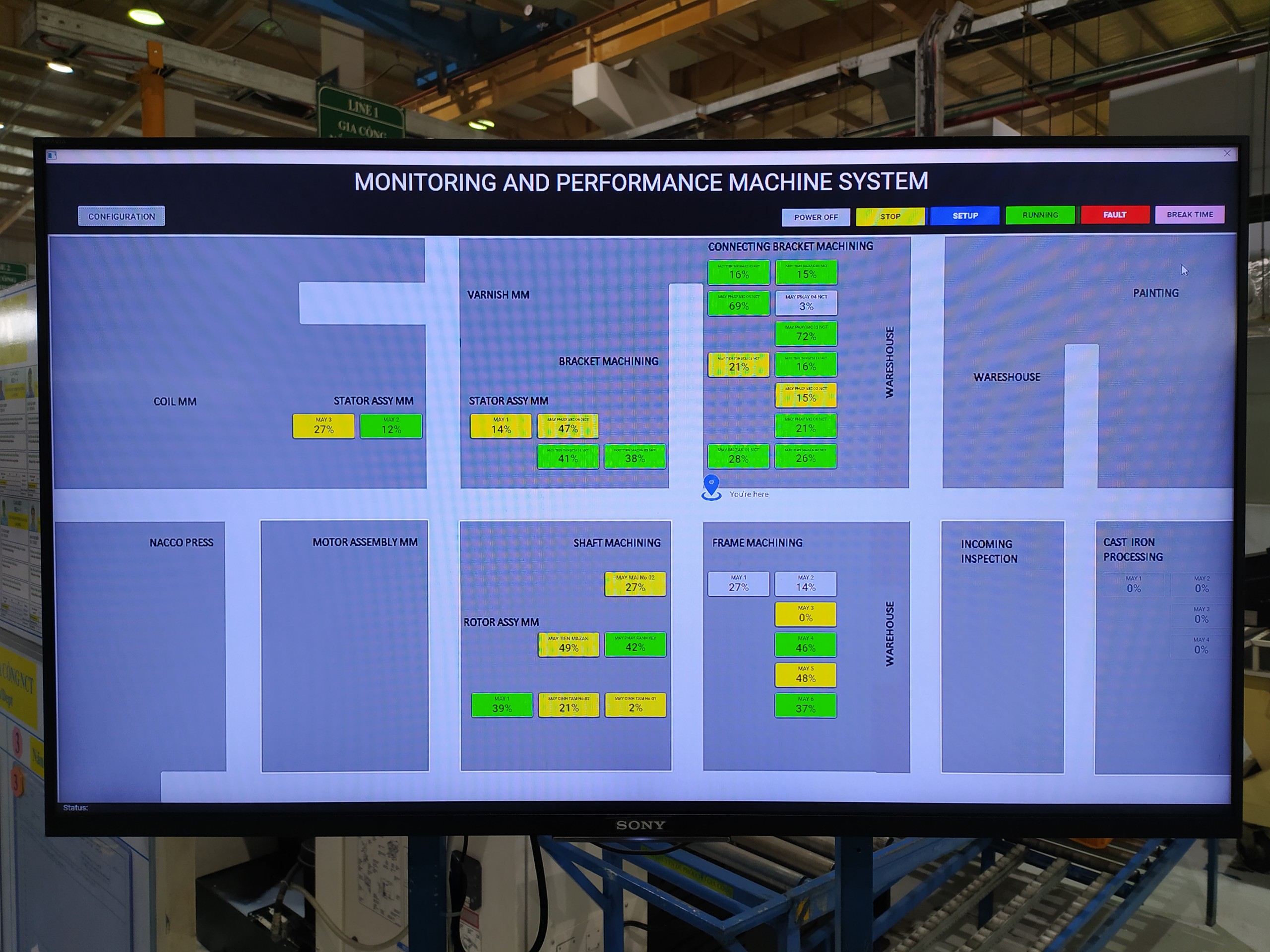 Hệ thống giám sát hiệu suất máy do công ty cổ phần điện công nghiệp Nam Việt cung cấp giúp người quản lý thu thập được những thông tin cần thiết liên quan đến hiệu suất máy,trạng thái vận hành, người vận hành của từng máy.Từ những giữ liệu thu thập được giúp người quản lý dễ dàng đưa ra được những phương thức sản xuất và vận hành một cách phù hợp nhất.